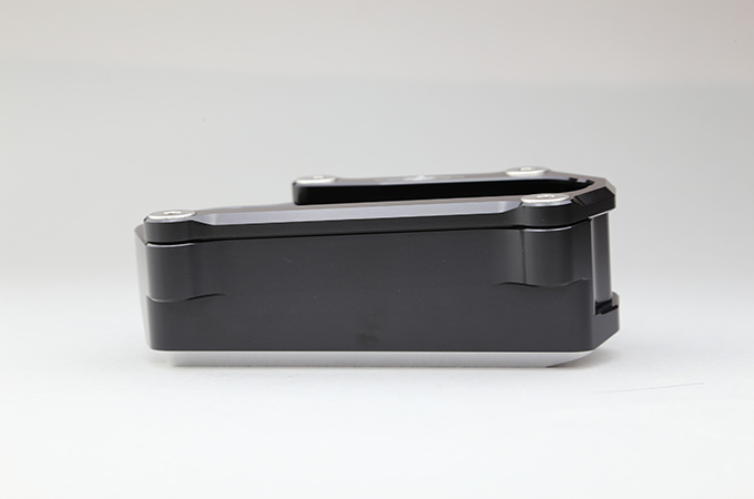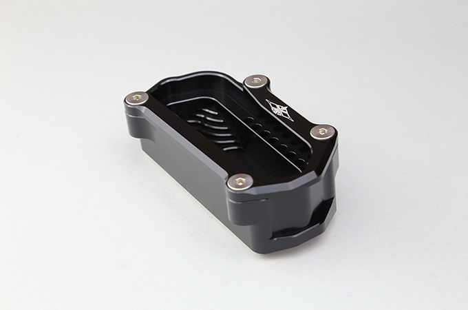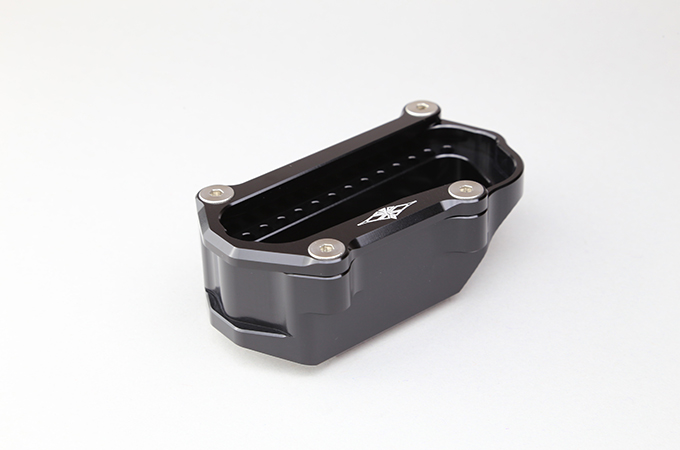 サイドスタンド使用時に、余分な車体の傾きを抑制することにより車両の引き起こし及び、取り回しを向上させます。スタンドの接地面積も増大するため、軟弱な路面に停車した場合でも、サイドスタンドのめり込みを防止します。高さはノーマル比で約23mmアップ。ジュラルミン削り出し製、ブラックアルマイト仕上げ。