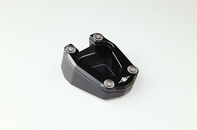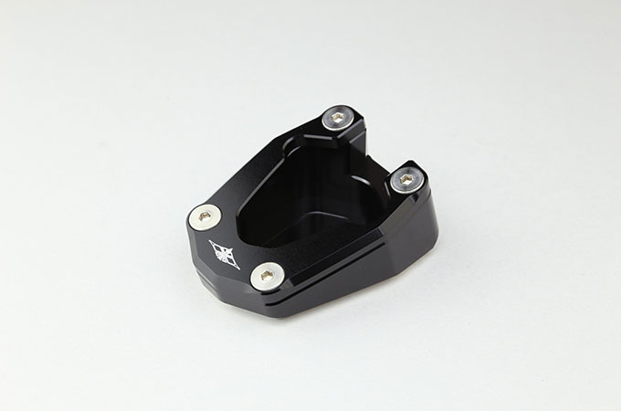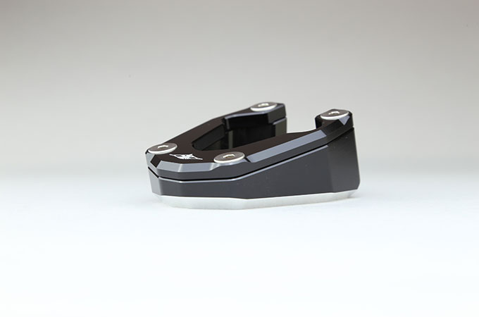 サイドスタンド使用時に、余分な車体の傾きを抑制することにより車両の引き起こし及び、取り回しを向上させます。スタンドの接地面積も増大するため、軟弱な路面に停車した場合でも、サイドスタンドのめり込みを防止します。高さはノーマル比で約3mmアップ。ジュラルミン削り出し製、ブラックアルマイト仕上げ。