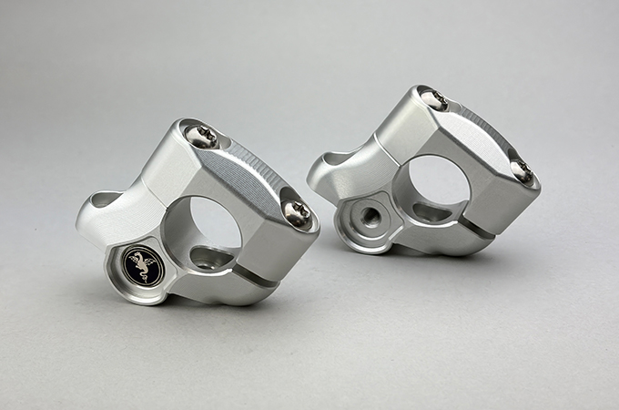 ノーマルのハンドルポストに挟み込んで使用するハンドルセットバックライザーです。ハンドル位置はノーマル比で約27mmバック、約13mmアップ。ジュラルミン削り出し製、シルバーアルマイト仕上げ、七宝焼きエンブレム付き。